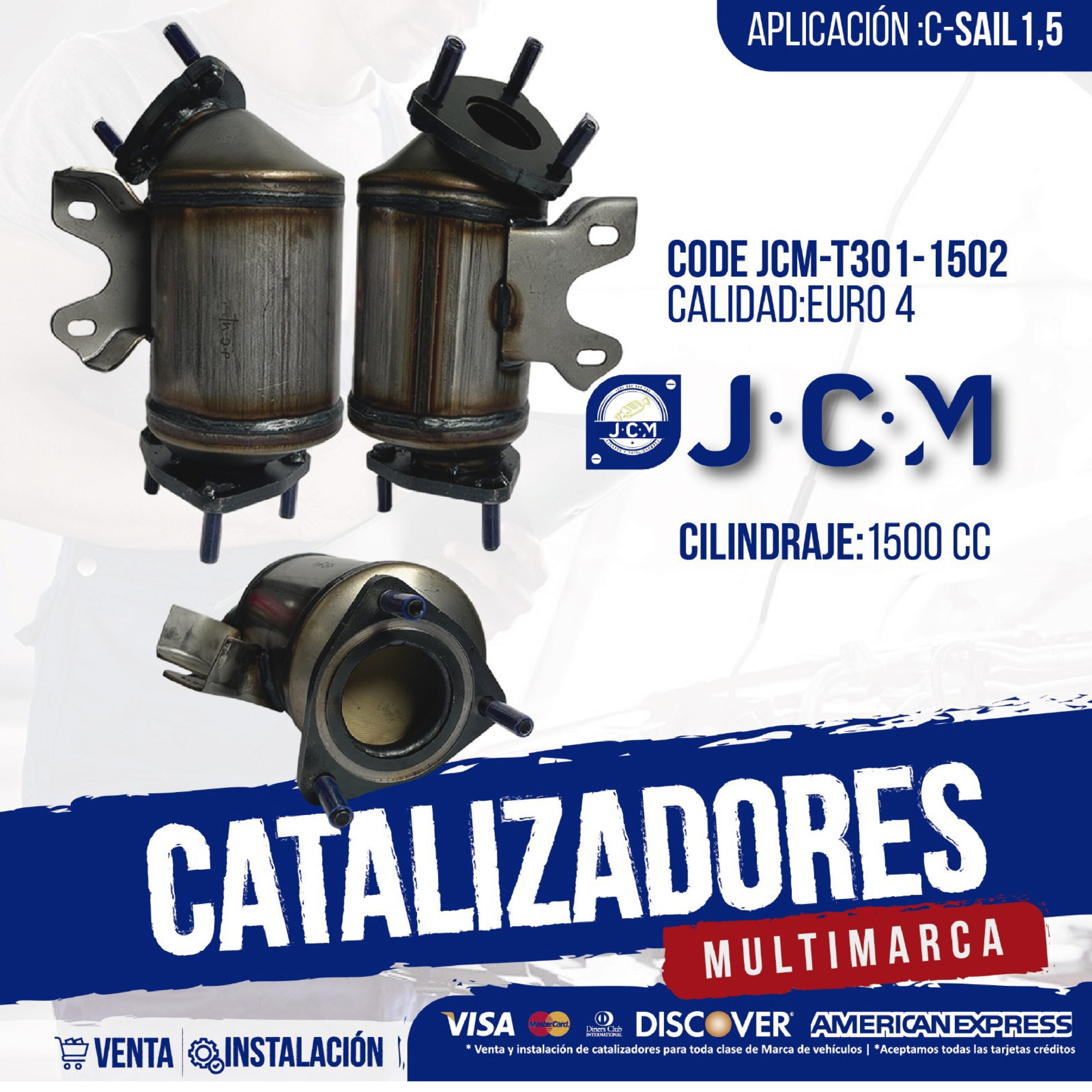 Catalizador JCM T301-1502, compatible con C-Sail 1.5 1500 cc, norma Euro 4. Diseñado para reemplazo del sistema de escape, reducción de emisiones y cumplimiento de Revisión Técnica Vehicular (RTV). Producto multimarca, disponible para venta e instalación.