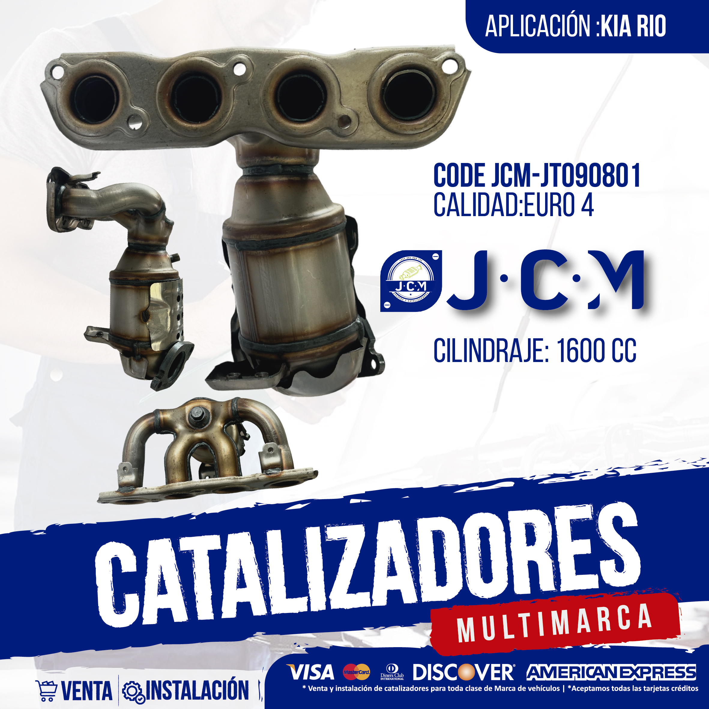 El Catalizador JCM JTO90801 Euro 4 está diseñado para vehículos Kia Rio con motor 1600 cc, cumpliendo con los estándares de emisiones exigidos por la normativa Euro 4. Es una solución confiable para el reemplazo del sistema de escape, ideal cuando el vehículo presenta fallas en pruebas de emisiones o desgaste del catalizador original.