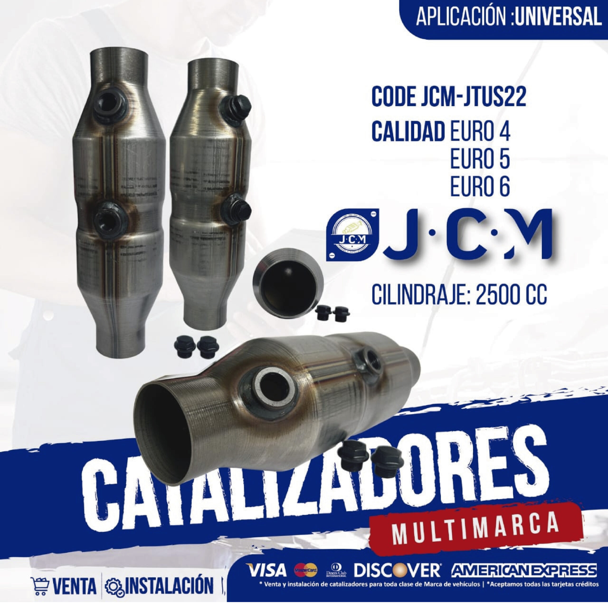 Catalizador JCM JTUS22, aplicación universal para motores 2500 cc. Disponible en normas Euro 4, Euro 5 y Euro 6. Diseñado para reemplazo del sistema de escape, reducción de emisiones y cumplimiento de Revisión Técnica Vehicular (RTV). Producto multimarca, disponible para venta e instalación.